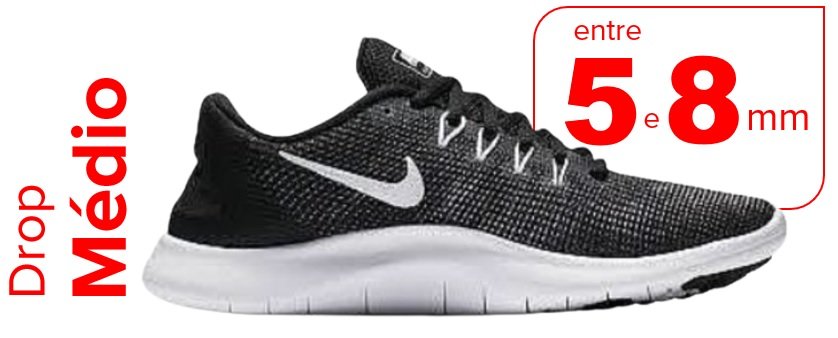 Os tênis com drop médio ficam entre 5 e 8 mm, oferecendo um equilíbrio entre conforto e eficiência na passada, sendo adequado para corredores intermediários ou para quem faz caminhadas e busca um desempenho mais natural. Segundo os fabricantes, este drop promove uma aterrissagem com o médio ou antepé, reduz o impacto no calcanhar e oferece um suporte adequado para a postura.