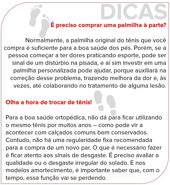Marco Túlio indica, ainda, dois outros aspectos a serem levados em conta na hora de comprar o tênis para esportes: “Ele tem que ser firme no tornozelo. Ou seja, a pessoa não pode andar e sentir que o calçado está saindo dos pés. E a parte da frente não pode apertar os dedos. O ideal é que se consiga movimentar um pouco os dedos dentro do calçado, de forma que ele não esteja apertando e seja possível realizar a atividade física sem dor”.